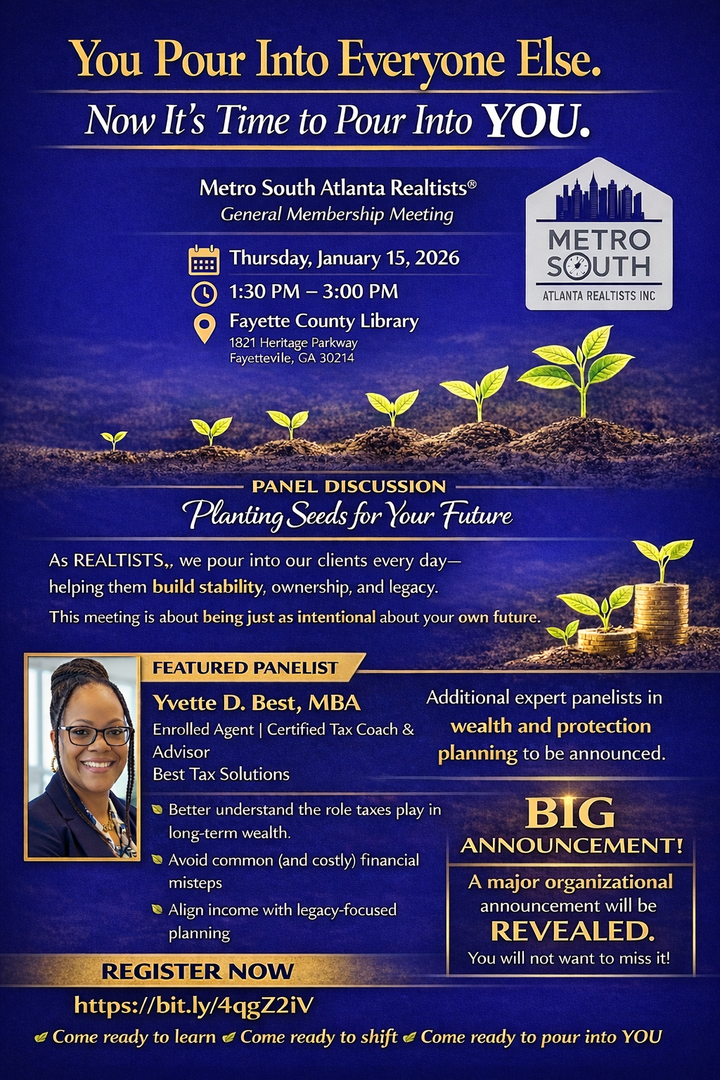 Metro South Atlanta Realtists, one of MSAR's Partnered Organizations, is hosting their first General Membership Meeting of the year on January 15, featuring a Panel Discussion: "Planting Seeds for Your Future." Additionally, a MAJOR organizational announcement pertaining to the Realtists will be revealed. Come ready to learn, ready to shift, and ready to pour into you!